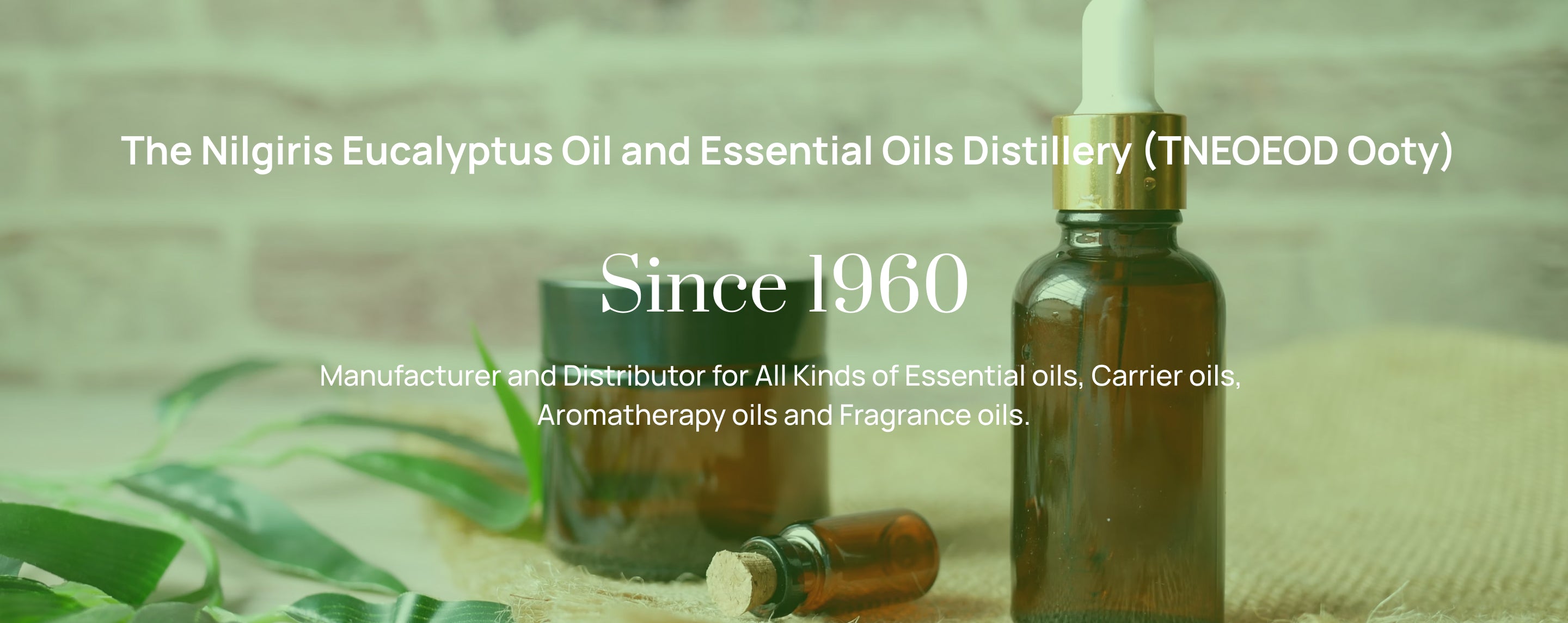 The Nilgiris Eucalyptus Oil and Essential Oils Distillery (TNEOEOD Ooty) is a renowned Manufacturer, Supplier, and Exporter in the industry since 1960s. The company is engaged in the manufacturing of Essential Oils, Hydrosol waters and Handmade Herbal floor wash concentrates, etc.